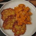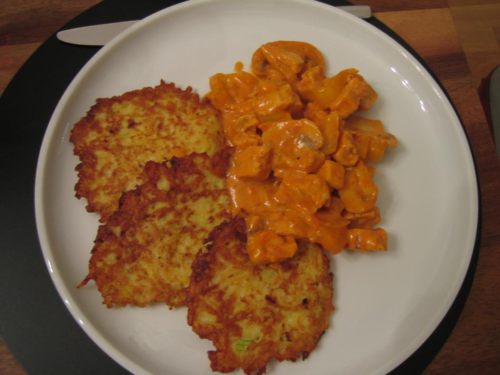 女woman wollte eigentlich den Nachmittag und Abend mit ihrem Patenkind verbringen. Auf der Suche nach einem Menü für den Abend stolperte ich über die Kartoffel in der Gemüseschublade unseres Kühlschrankes. Warum nicht die Kartoffelpuffer ausprobieren, die mir schon einige Zeit im Kopf herumschwirrten? Auf chefkoch.de gibt es Sage und Schreibe 216 Rezepte für Kartoffelpuffer. Entschieden habe ich mich für die Variante „Kartoffelpuffer original holländisch„. Somit war die Beilage klar. Für die Hauptspeise würde ich wieder bei Hiltl fündig: Vegetarisches Zürcher Geschnetzeltes. Anstelle des Kalbfleisches wird hier Quorn oder Tofu verwendet, in meinem Fall Quorn-Geschnetzeltes.