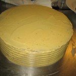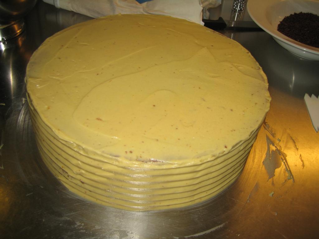 Der Tortenboden ist ein normaler Biskuitboden. Nach dem Backen verkehrt auf ein Backpapier gestürzt und einen Tag ruhen gelassen bekommt man eine schöne Tortengrundform.