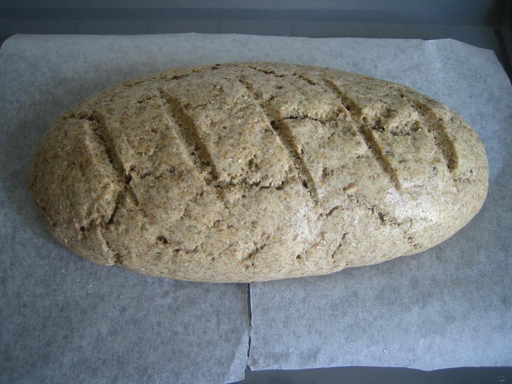 Die Hefe mit dem halben Wasser und dem Zucker in einer Mulde des Mehls verrühren und warten, bis es zu schäumen beginnt. Die restlichen Zutaten beifügen und zu einem kompakten, glatten Teig kneten. Zwei Stunden aufgehen lassen, einen Brotlaib formen und noch einmal eine Stunde aufgehen lassen. Bei 210°C (Umluft) 1o Minuten backen und dann 30 Minuten auf 160°C fertigbacken.